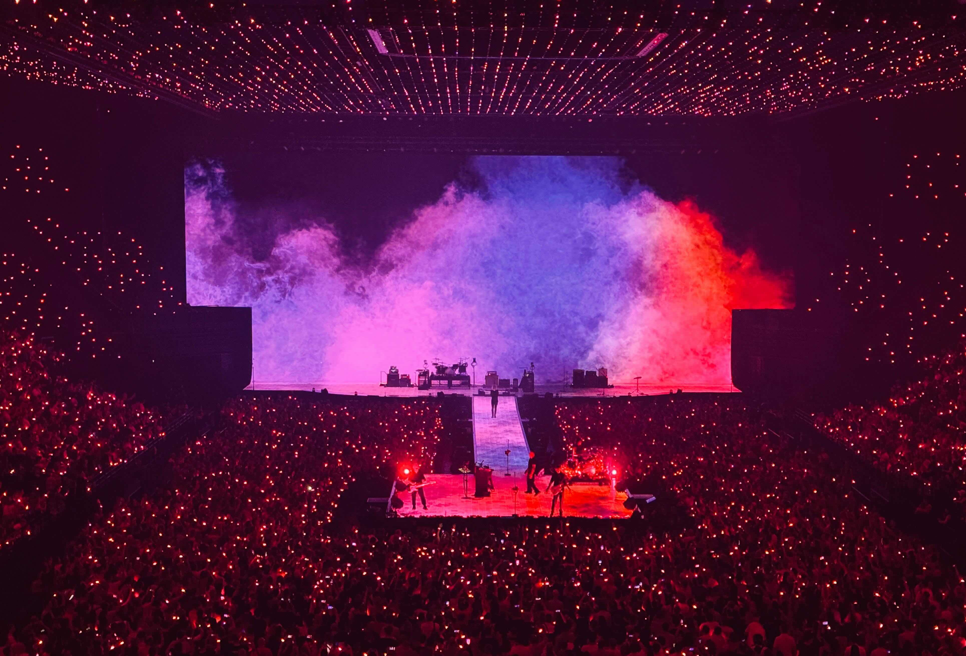 Indochine voulait que leur expérience couvre le plus de surface possible avec des effets spéciaux. Résultat : on a combiné les bracelets portés par les fans avec des pixels semi-permanents… pour transformer chaque salle en boîte immersive de lumière - exploitant chaque centimètre du plafond et de la foule pour créer des effets dynamiques.